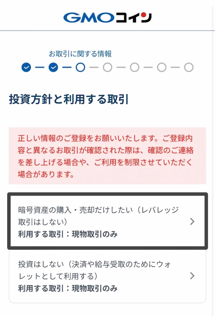 途中、13番目の「投資方針と利用する取引」という箇所で2択を選択する画面があります。