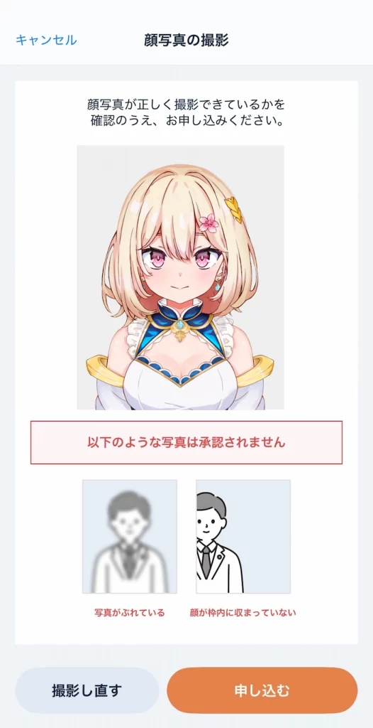 自分の顔を撮影する画面が表示されるので、枠に顔を合わせて撮影してください。