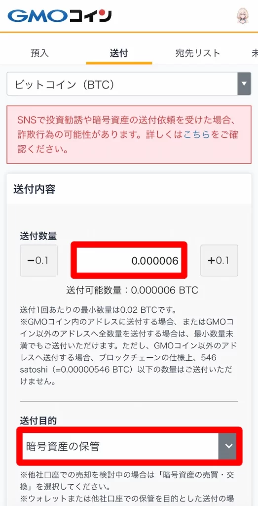 少し上で解説したように、GMOコイン では、原則として1回あたり0.02 BTC未満の送金はできません。