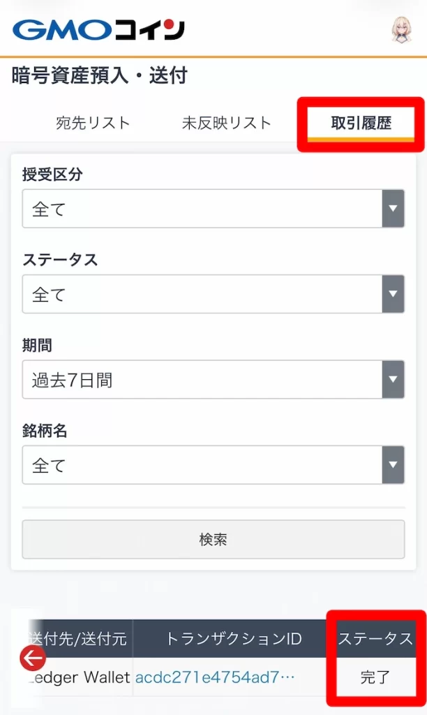 ステータスに「完了」が表示されていなければ、そもそもの送金処理がまだ完了していません。