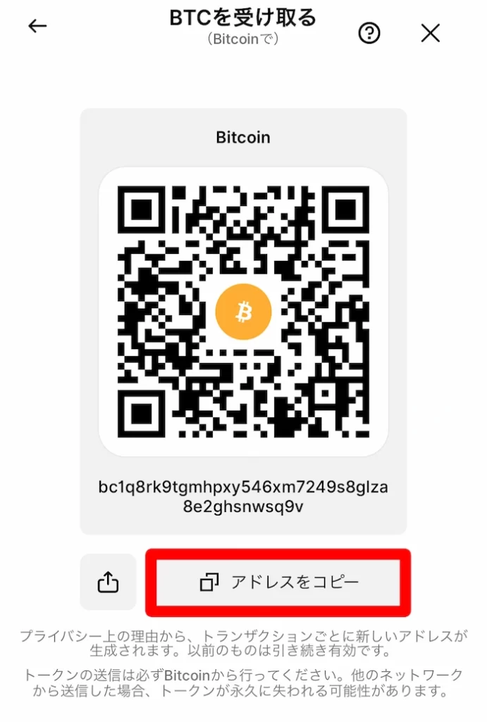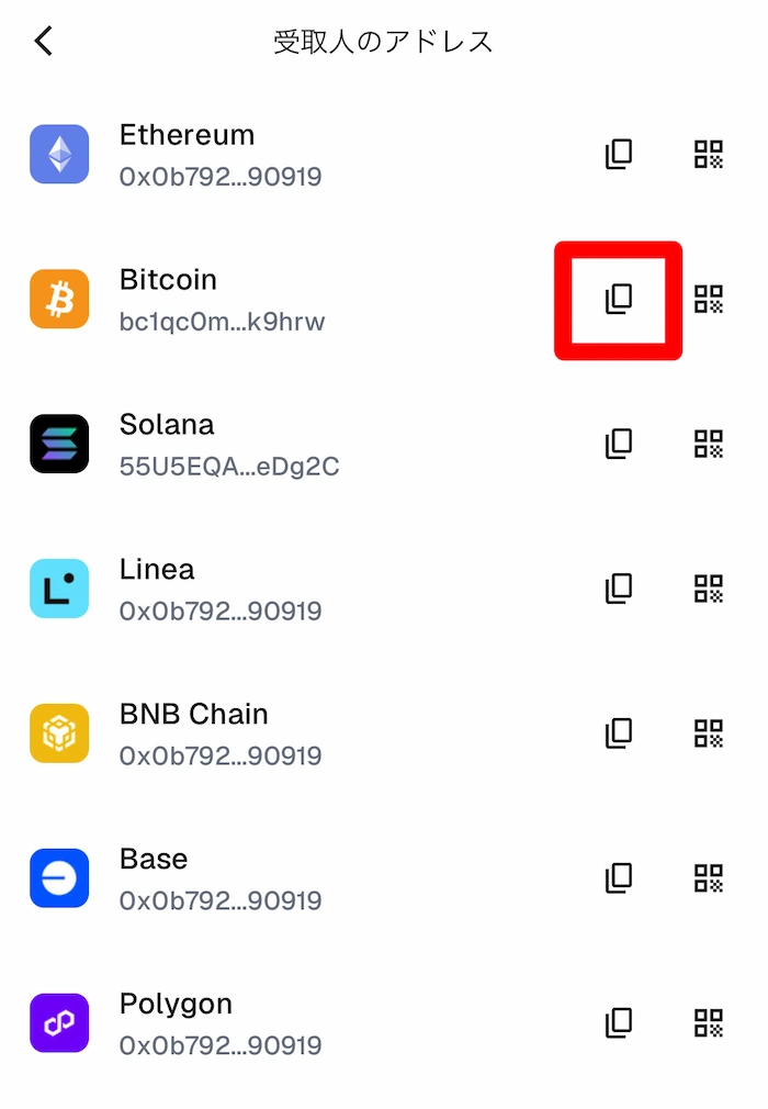 一覧の中からBitcoinアドレスの右にあるアイコンをタップすることで、ウォレットアドレスをコピーすることができます。