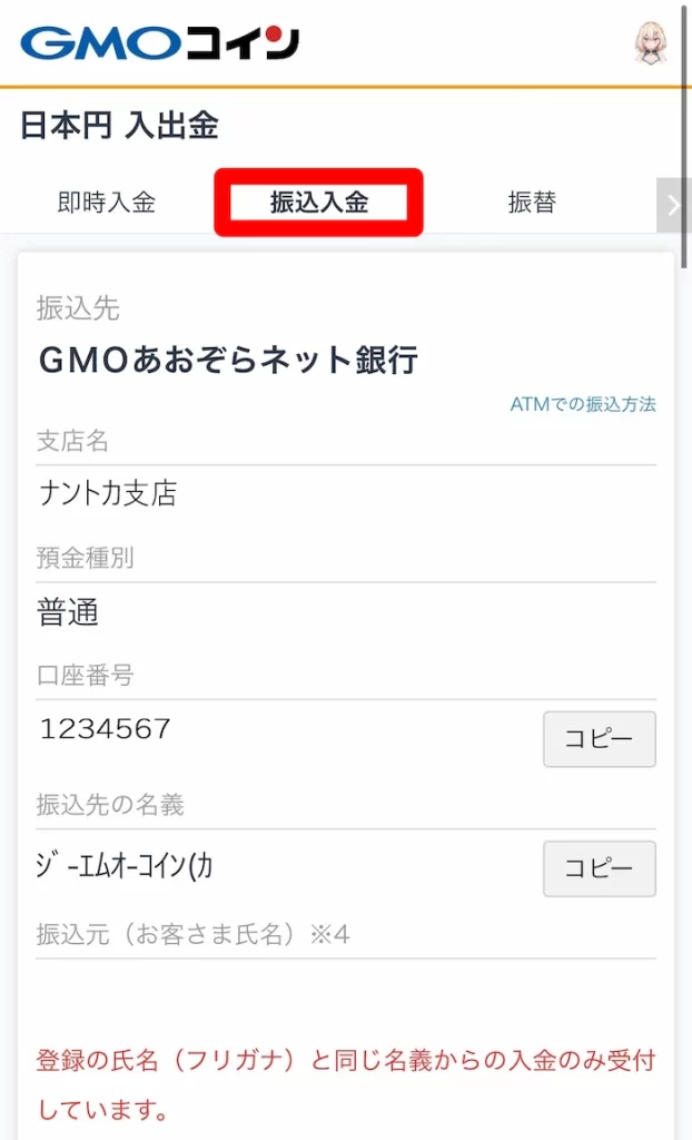GMOコインでは、口座名義と振込元の名義が一致している必要があります。