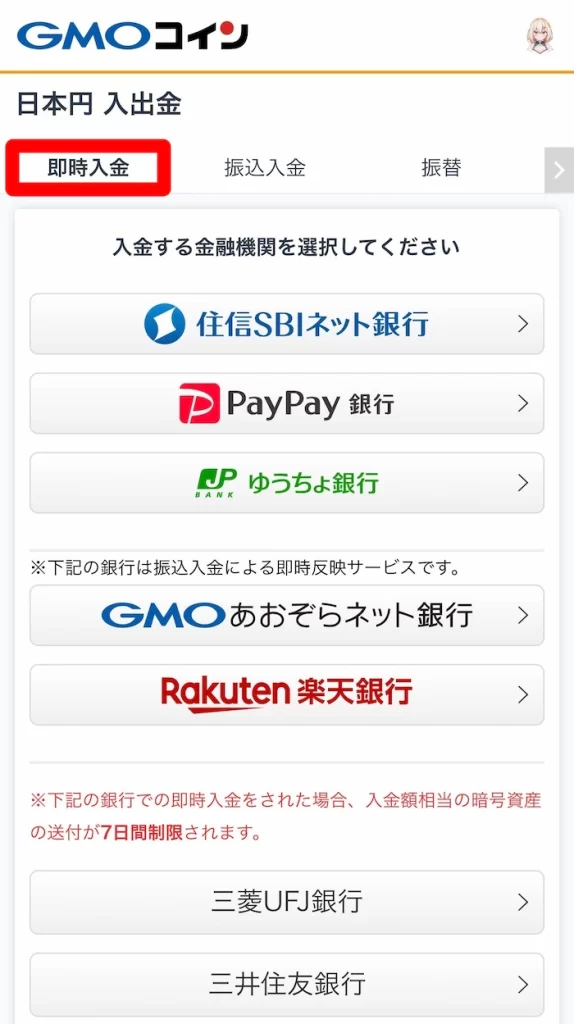 日本円の入出金メニューが表示されるので、「即時入金」タブにある金融機関を選びます。