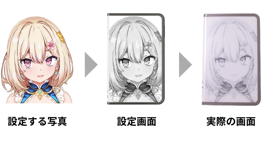 E Inkの仕組み上これは仕様に近いもので、綺麗に見せるためには、設定する画像を事前にイラストソフトなどで濃く編集する必要があります。